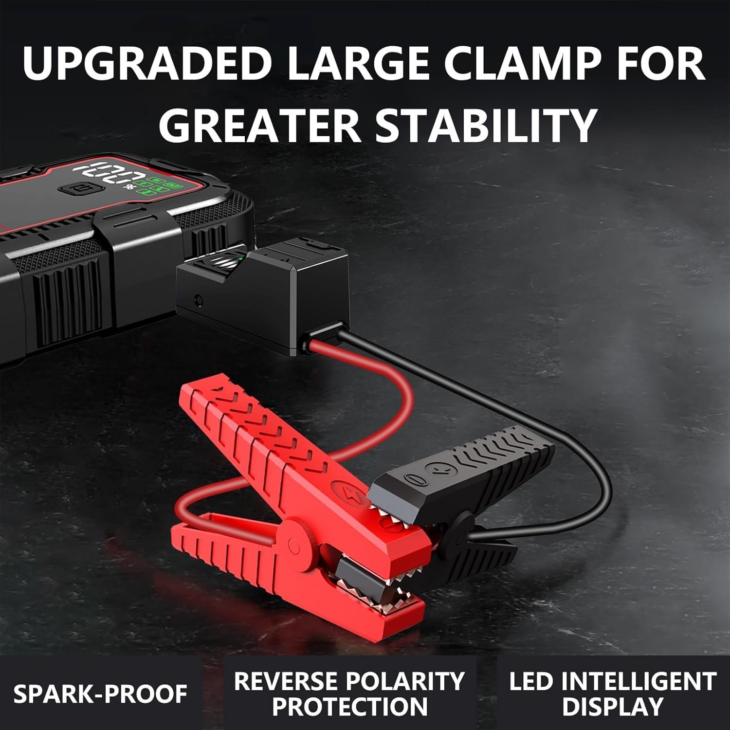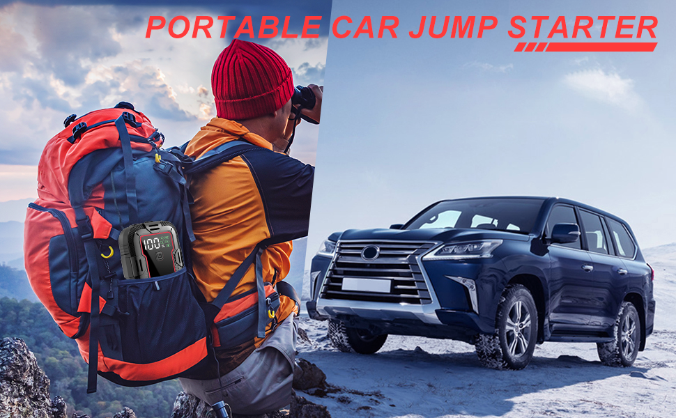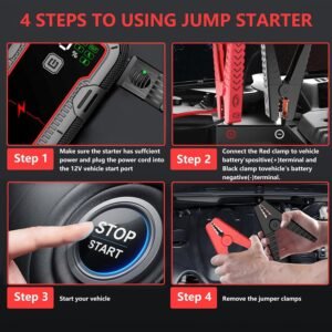 Equipped with a built-in LED flashlight, this jump starter features four modes: Flashlight, Strobe, SOS, and Warning. An essential car accessory for emergencies, it ensures you’re prepared whether stranded at night or signaling for assistance. The multifunctional lighting options enhance visibility and safety in critical situations.