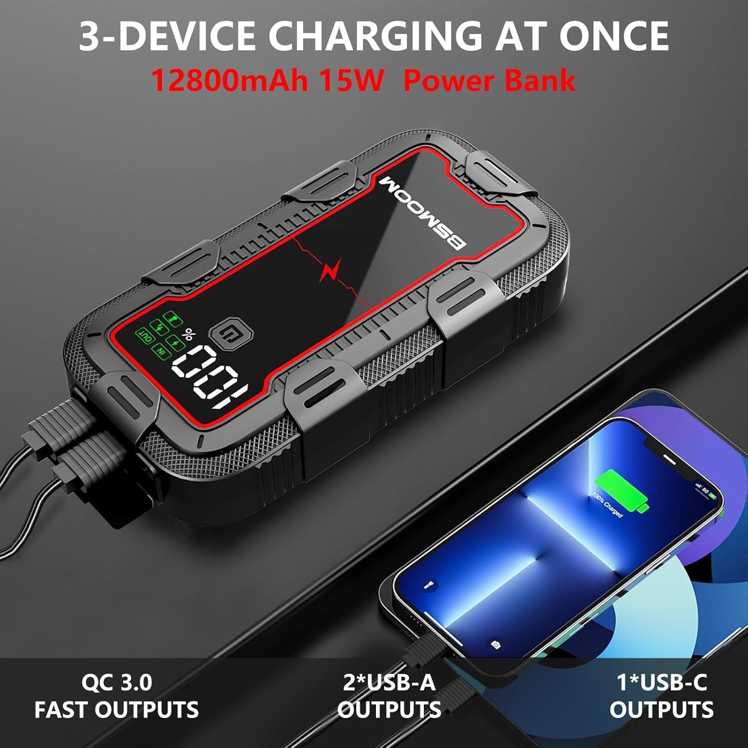Functions as a versatile power bank with 18W Type-C input and multiple USB outputs (5V 2.4A, 5V/9V/12V fast charging) to keep your devices powered up quickly. This versatile device serves not only as a portable battery jump starter but also features dual USB outputs, including a Quick Charge 3.0 port for rapid charging of your mobile devices.